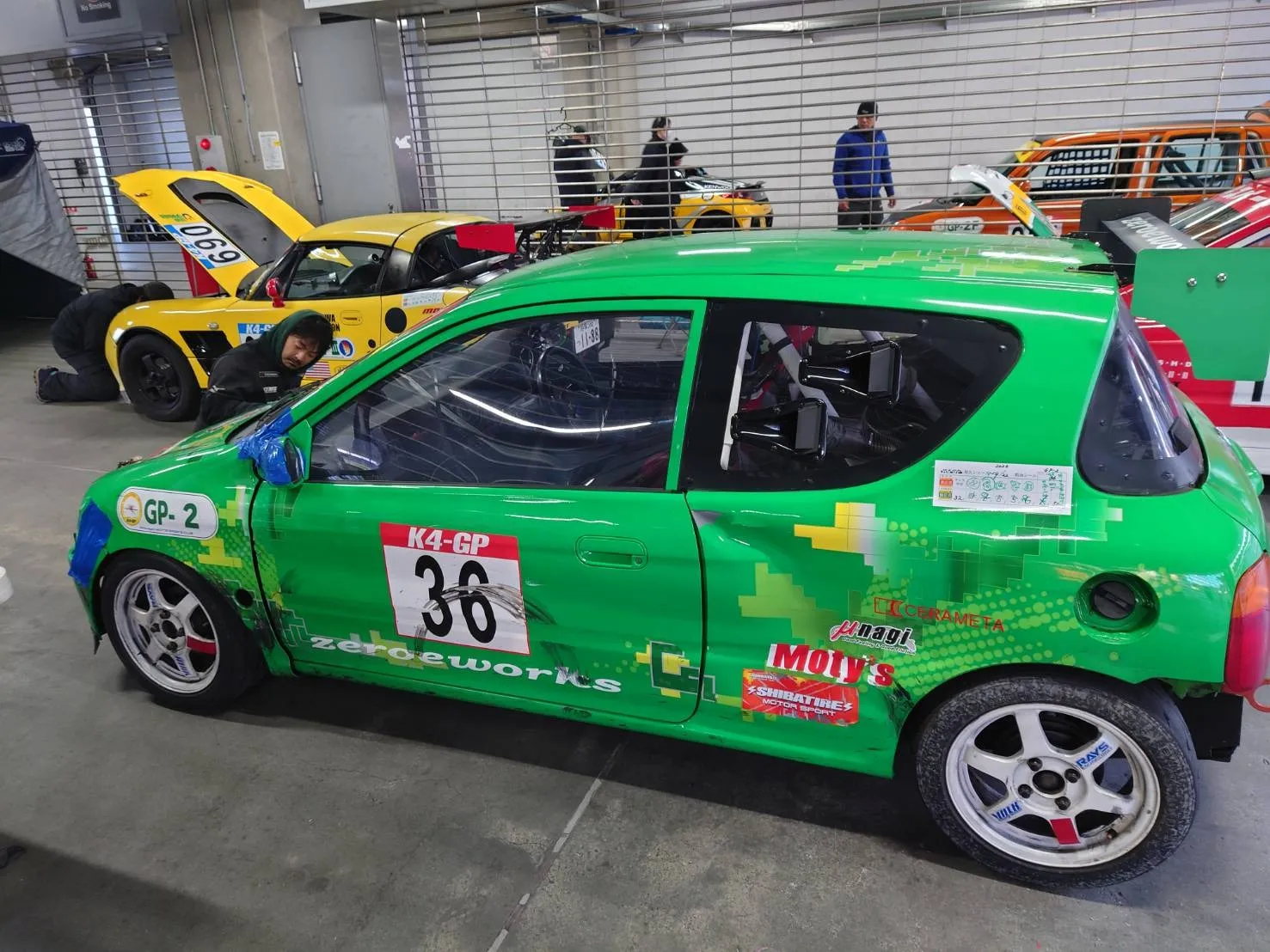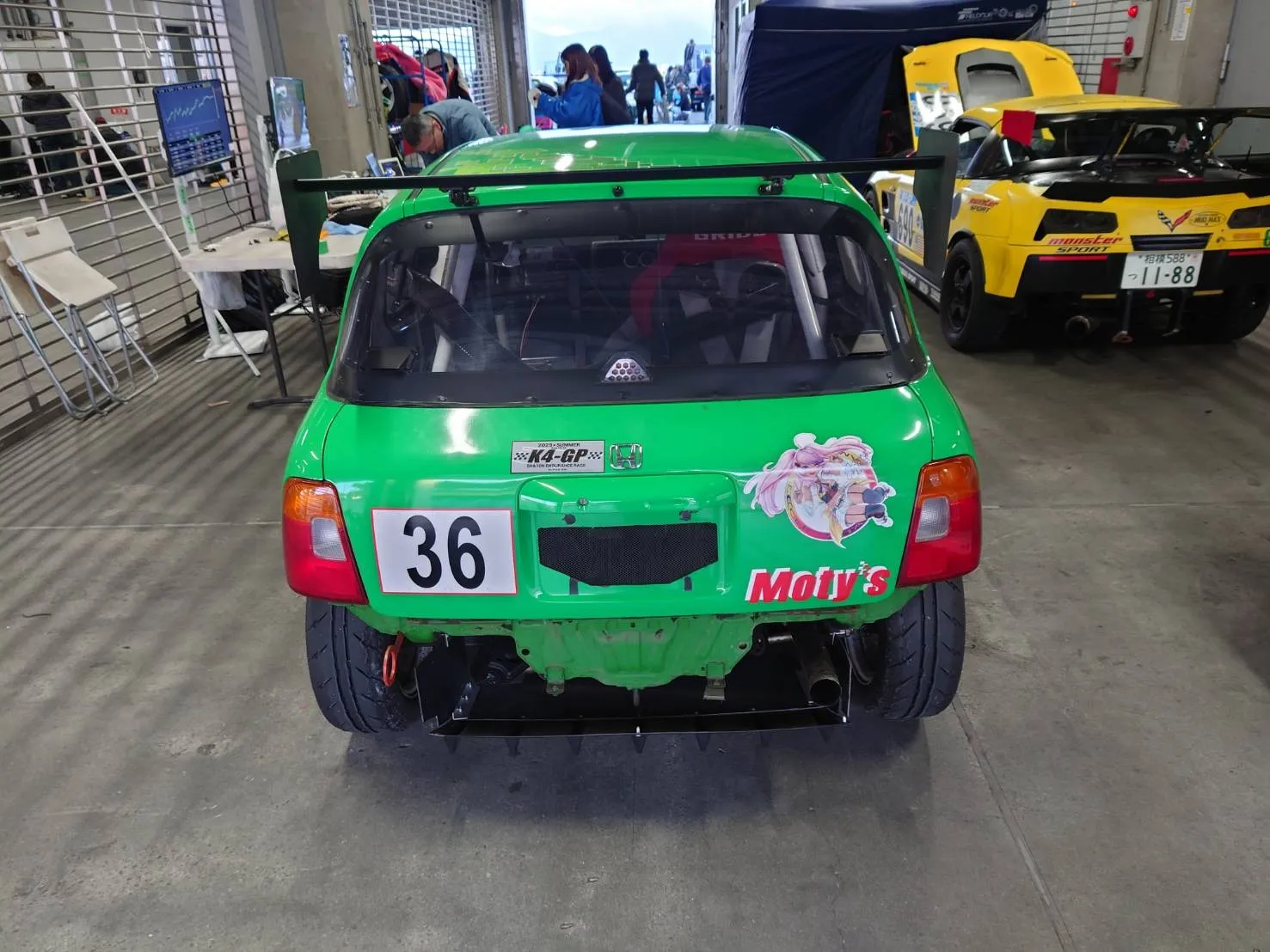 富士スピードウェイのピットに佇む鮮やかなグリーンのマシン。ゼッケン「36」をつけたこの車両は、K4-GPに参戦しているホンダ・トゥデイ(JA-4)です。軽自動車による耐久レースとして知られるK4-GPは、単なるスプリント勝負ではなく、燃費・信頼性・チームワークといった総合力が問われる過酷な戦い。その舞台で、この小さなトゥデイは全力で走り続けます。