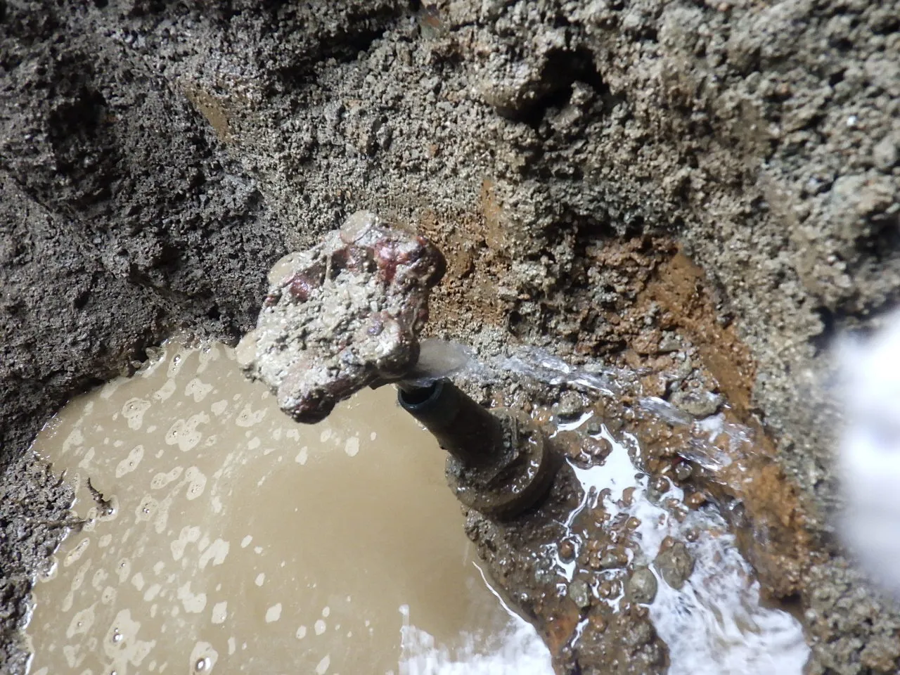 写真の通り、実際に漏水している状況が確認でき、設備の老朽化による影響がはっきりと分かる状態でした。このようなケースでは、早期対応が非常に重要になります。放置すると漏水量が増え、地盤への影響やさらなる設備の損傷につながる可能性があるためです。